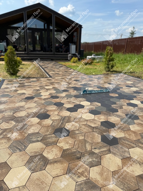 Костровая зона «Хекса лаунж» из тротуарной плитки Соты Песчаник, Белый, Серый и Черный