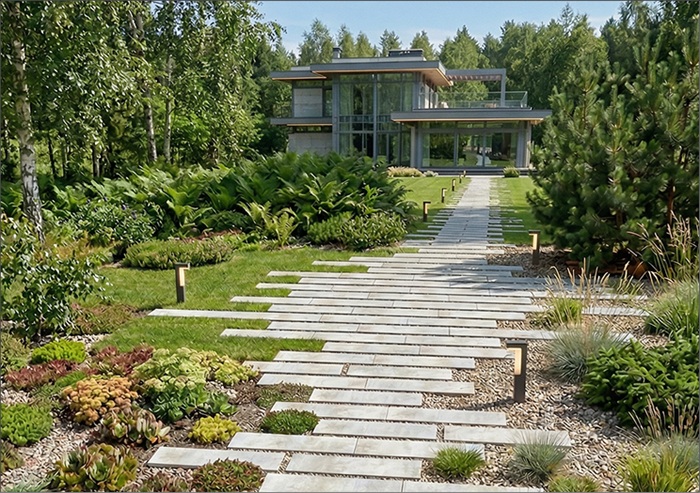 У каждого решения свои плюсы: газон создаёт естественный вид, а декоративная отсыпка делает дорожку более графичной и аккуратной.